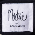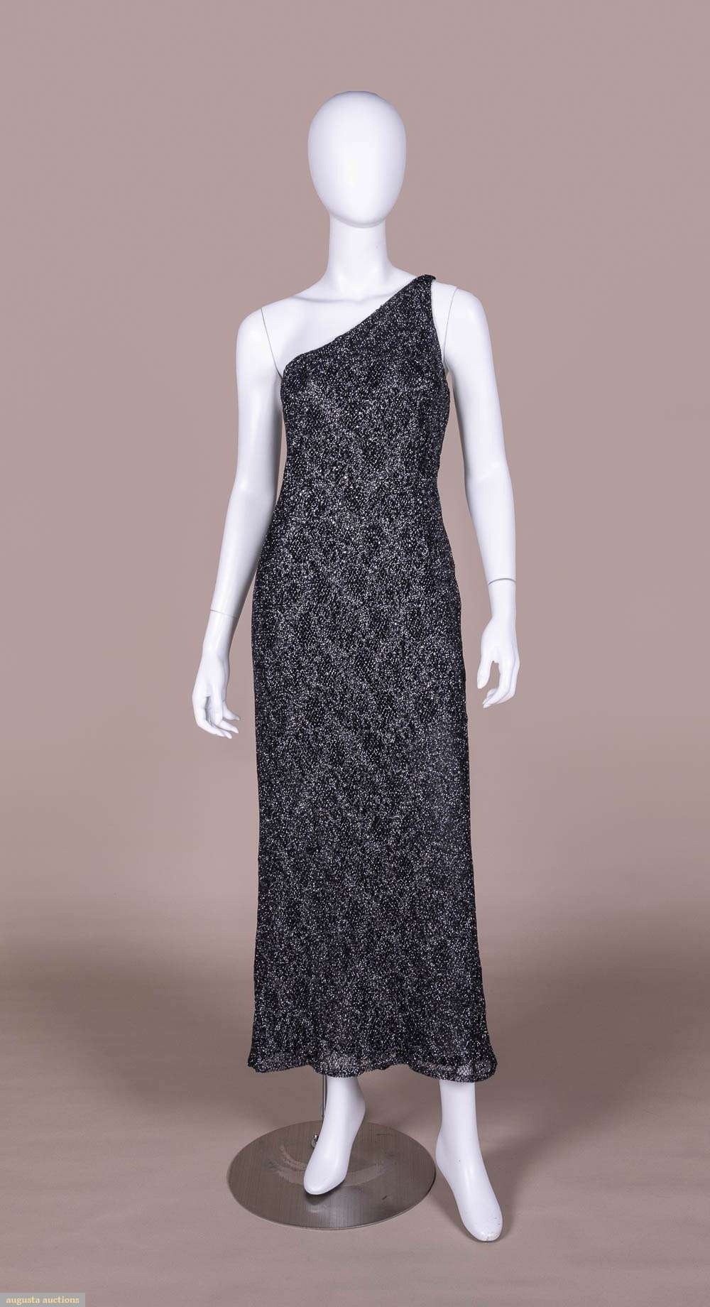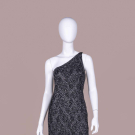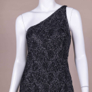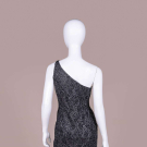 One-shouldered black & silver patterned metallic evening dress, label “Mackie by Bob Mackie”, B 38”, W 36”, L 53”. Excellent.