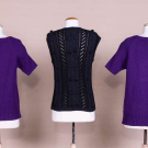 2 identical purple merino short-sleeved pullovers, label “Versace Classic”, c. 1990, B 37”-42”, L 26”. 1 black cable knit sleeveless pullover, label “Christian Dior Boutique”, c. 1980s, B 35”-42”, L 24”. Excellent.
