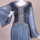 2-pc Arabian inspired fancy dress costume, silk panne velvet & crepe w/ faux pearls, crystal beads, short chatoyant bugle beads & coral, interior of sleeves embroidered in elaborate chainstitch motifs, gimp bodice underdress of silk crepe de chine w/ same embroidered to hem, lined in silk crepe, bodice B 36", W 29", L 20", underdress B 34", W 32", L 54". Very good.