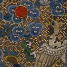 For front of robe, silk embroidered gauze, crane facing orange sun, couched gold background grid, silk damask backing, 11.75" x 11", excellent.
