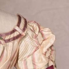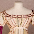 Cream ground w/ pink & ombre green stripes, short puff sleeve, tabbed neckline trimmed w/ purple satin bands, magenta wool undersleeves & three bias self fabric bands at hem, B 30", Hi W 23", L 52", (wool sleeves damaged) other than removable wool sleeves, excellent.