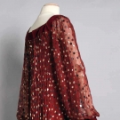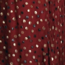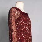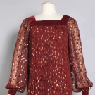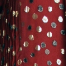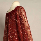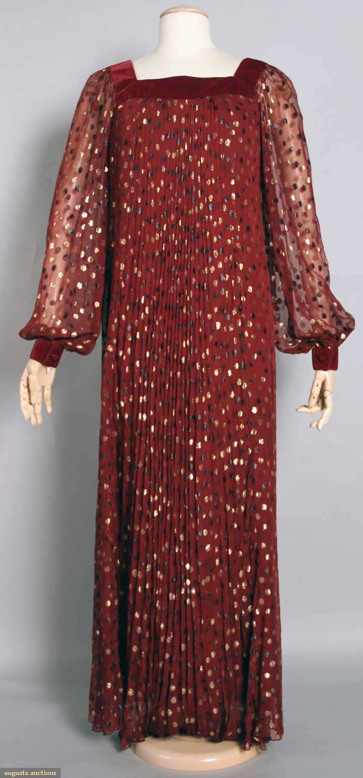 Cranberry silk chiffon w/ black & gold lame poka dots, square velvet neckline, velvet cuffs, dress accordian pleated, label "Givenchy" & "64970", B 36", H 40", L 61, excellent. Fashion Institute of Design & Merchandising
