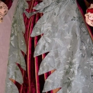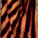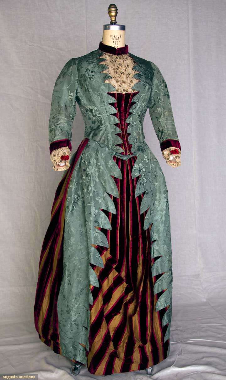 2-piece, silk faille w/ silk floral design, metallic embroidered cream lace & burgundy velvet bodice trim, skirt w/ striped panels of burgundy ribbed velvet & gold silk, forest green skirt lining w/ built in bustle, B 38", W 31", Skirt L 39"-43", label "Marion Dickā¦.New York", very good. Brooklyn Museum