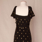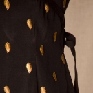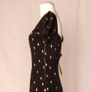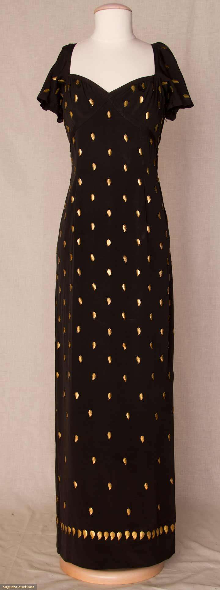 Silk faille covered w/ diagonal rows of gold metal leaves, cap sleeves, bands criss-cross over bust & tie in back, slight train, B 32", W 27", H 36", L 56-60", (few leaves unstitched, back neckline frayed at inside corners) very good. Brooklyn Museum