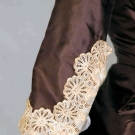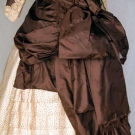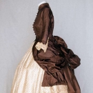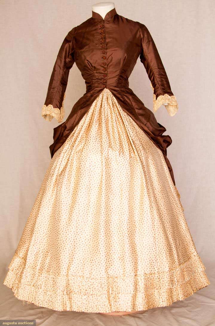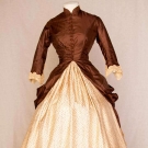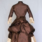 Chocolate brown polonaise bodice extends to side draped & back bustle over-skirt, 10 crochet ball buttons, cream silk twill skirt w/ tiny brown flower head print, skirt has CB square insert of solid brown & bustle ties, embroidered lace cuffs, tan cotton lining, B 32", W 23", Skirt L 37", excellent. Brooklyn Museum