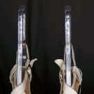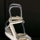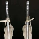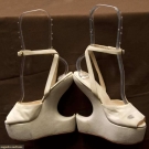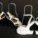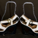 1 pair white suede, slide vamp & open toe, front suede platform 1.5" to 5.5" beneath heel, cut-out platform heel in shape of upside down half heart, leather sole stamped "Victor NYC", ankle straps, same pair in red shown at Brooklyn Museum's summer 2010 costume exhibit & in 2011 shoe calendar at MET & Brooklyn Museums' shops, size 6a, (stains); t/w 1 pair white suede, cross strap vamps, black wood cut-out platforms w/ split sole, (soles chipped, suede dirty) both pair very good. Brooklyn Museum