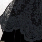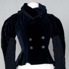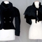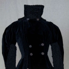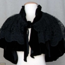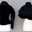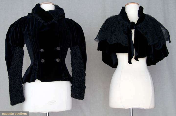 Both black velvet: 1 short evening capelet, CF tie, black lace over-lay, label "Paquin 3 Rue de la Paix Paris", CBL 17", (1.5" hole in lace) very good; 1 unlabeled fitted suit jacket w/ pin-tuck detail & black Persian lamb trim, 6 metal leaf buttons, gathered sleeve top, silk faille lining, B 34", W 27", CBL 20", excellent. Brooklyn Museum