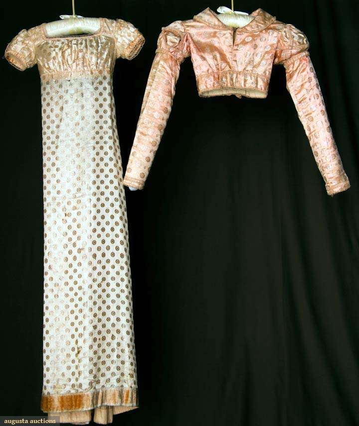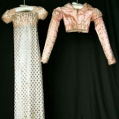 For 9-12 year old girl, dress w/ pale pink satin & dot brocade, high empire bodice, short puff sleeves, pink loop trim at neckline & sleeve edge, 2" peach plush hem trim, B 24", L 46.5", (several places holes & stains) fair; spencer darker pink shade of silk-satin w/ cream silk circular brocade, trimmed w/ same looped trim as dress, long sleeves & sleeve puff w/ lattice work design, CB ruched self-fabric trim w/ thread buttons, B 24" W 20" CB L 10", (fading) very good. Brooklyn Museum