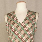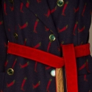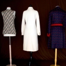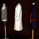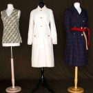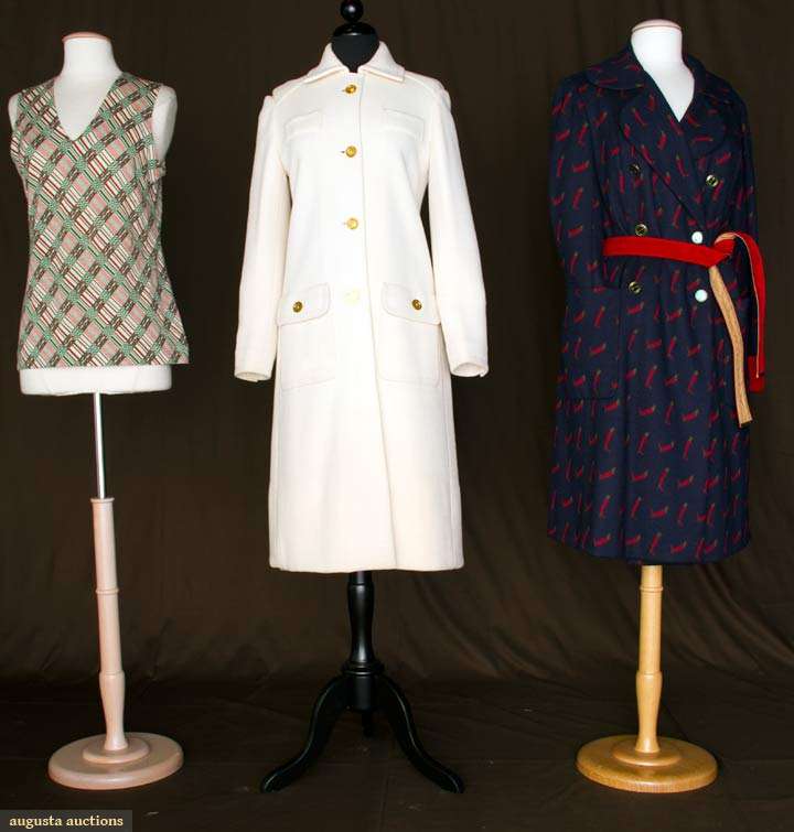 1 winter white Hermes coat, wool knit, 2 patch pockets, 4 CF gold buttons marked "Hermes Sport", label "Hermes Execute Speciale Ment par Jessy, Made in Belgium", B 35" H 40" L 42"; 2 "Gucci", both marked "Gucci 100% Wool Made in Italy": 1 navy knit coat printed w/ red & green riding boots, green & gold logo buttons, red leather belt, B 40" L 42", 1 knit shell in white red & green diagonal plaid w/ herringbone checks & double horseshoes, B 36" L 25", excellent. Fashion Institute of Design & Merchandizing