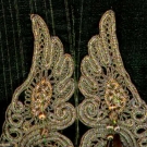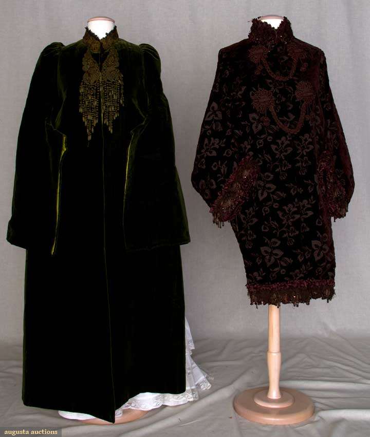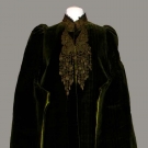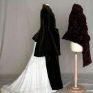 Both w/ dolman sleeves & front lap extentions: 1 deep forest green w/ green passementerie & knotted fringe at CF & low back peplum, corded acid green silk lining; 1 deep plum cut to silk brocade leaves & pomegranates,beaded & looped fringe trim, very good-excellent. Brooklyn Museum