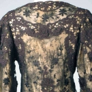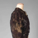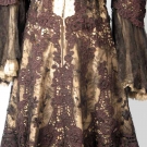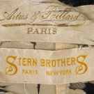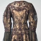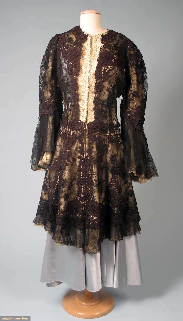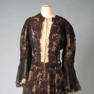 Hand embroidered net lace, black Battenburg lace inserts & edging, pastel embroidered rosebuds on cream CF placket, puff sleeves to elbow w/ deep black flounce below, fitted to waist w/ long peplum, ivory taffeta lining, 2 labels: "Artus of Paillard Paris" & "Stern Bros. Paris New York", B 34", W 30", L 42", (bodice lining shattered) excellent. Brooklyn Museum