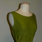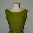Avocado green linen short shift dress, matching parabola coat w/ short sleeves & peter pan collar; original parabola muslin signed by Cashin, excellent. BROOKLYN MUSEUM