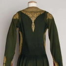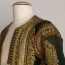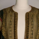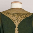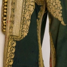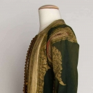 Forest green wool w/ long sleeves, gold embroidery & gilt ribbon trim, open front, L 48", (slight fading & holes) very good.