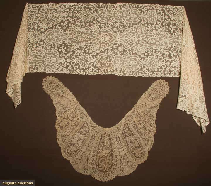 Deep circular Point de Gaz collar w/ front extensions, 14" x 44"; 1 Cream Milanese lace stole, small repeating floral pattern, 25" x 102", excellent.