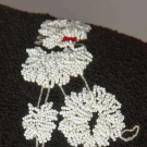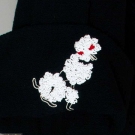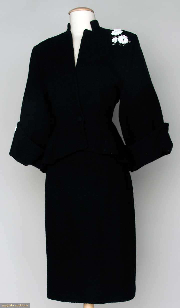 2-piece black wool suit w/ white beaded poodle on 1 shoulder & on 1 wide cuff, B 36", W 26.5", excellent.