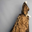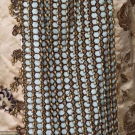 2-piece floral jacquard silk, panels of chenille lattice work w/ bead & bauble trim, B 34", W 25", Skirt L 41"-57", (missing 1 button & baubles) very good.