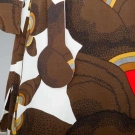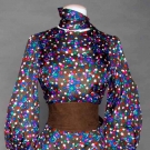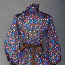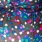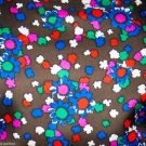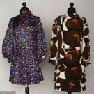 Both unlabeled: 1 white w/ large brown & orange flowers, shorter overdress, neck scarf, B 34", H 38", L 37", (dress let out on all seams, fabric piecing at center zipper, mends) very good; 1 brown w/ small floral print, balloon sleeves, gored skirt, attached neck scarf & brown suede belt, B 34", W 28", L 35", (2 small pieces of self-fabric expertly added at CB zipper) excellent. Bought at Pierre Cardin in Paris. Provenance: Mme. Erna de Paz, Argentine & Parisienne socialite.