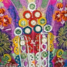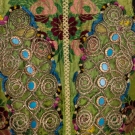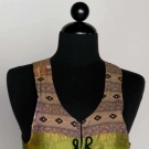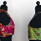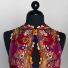 Both silk brocade: 1 magenta & red w/ decorative buttons & wool felt cutouts, excellent; 1 green w/ gold braid & turquoise buttons, very good.