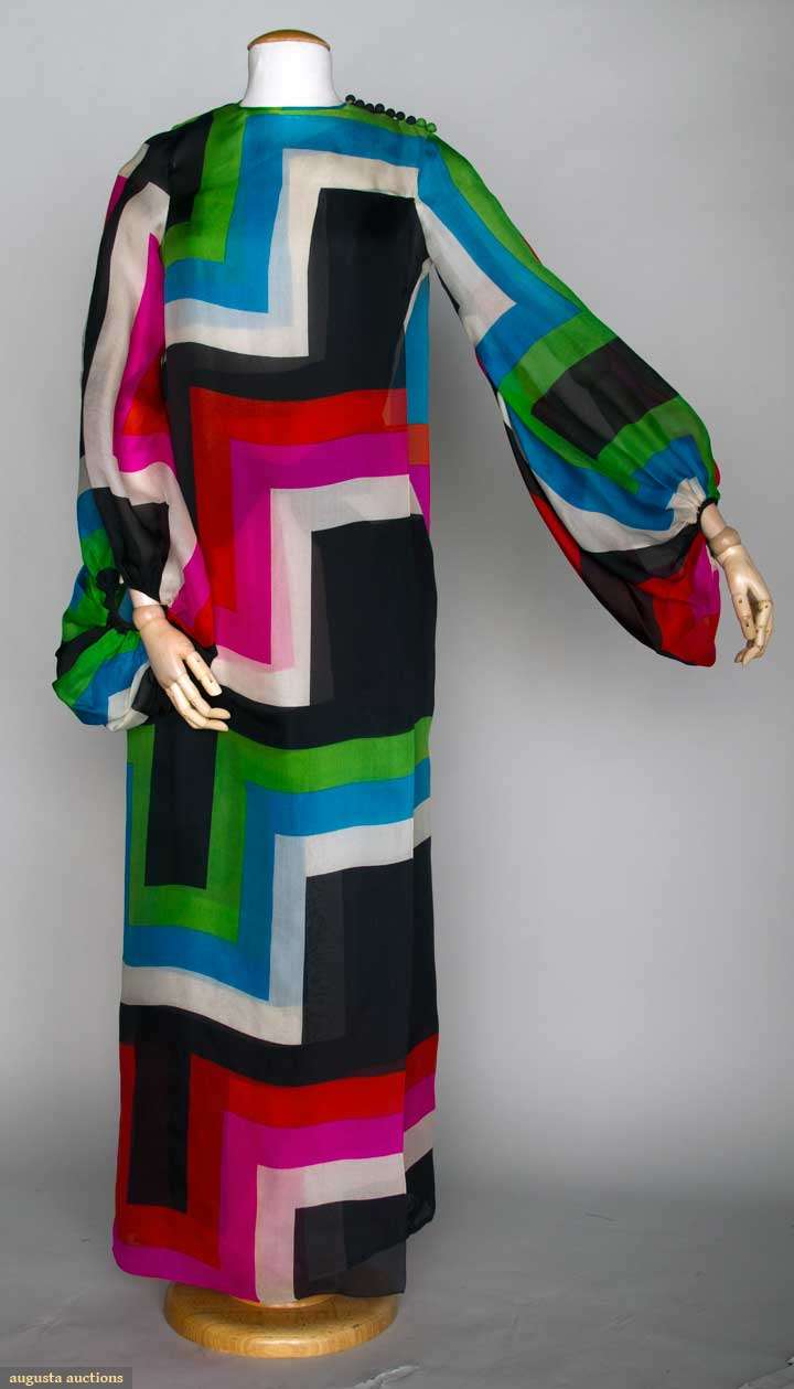 Single shoulder organdy sheath in black, white, blue, green, pink & orange geometric print, L side w/ long balloon sleeve, satin bow-front belt, optional tabard over-layer that buttons on L shoulder & has single R sleeve, open from shoulder to hem on L side, B 34", W 30", L 55", unlabeled & couture, (bottom layer's seams let out & 1 silk pull on R side, both hidden by tabard layer) very good-excellent. Bought at Pierre Cardin, Paris. Provenance: Mme. Erna de Paz, Argentine & Parisienne socialite.