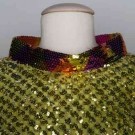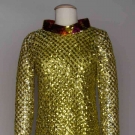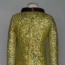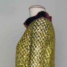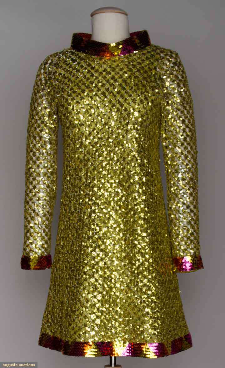 Silver all-over mesh completely covered in yellow sequins, neckband, cuffs & hem trimmed w/ band of pink, orange & yellow sequins in triangle pattern, yellow silk lining, unlabeled, B 34", L 34", (couple sequins missing on back neckband, many by back zipper) very good. Bought at Pierre Cardin, Paris. Provenance: Mme. Erna de Paz, Argentine & Parisienne socialite.