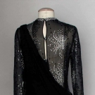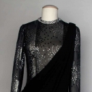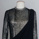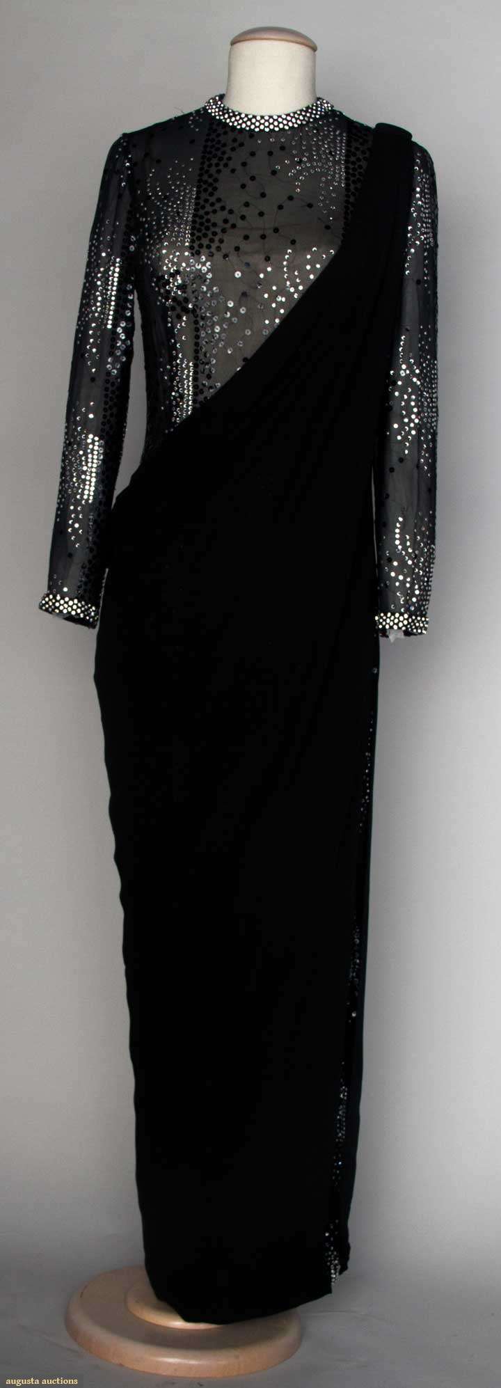 Sheer black silk long sheath decorated w/ rhinestones & black sequins, toga style overdress in black silk jersey, label "Pierre Cardin Paris", B 34", L 58", excellent. Provenance: Mme. Erna de Paz, Argentine & Parisienne socialite & friend of Msr. Cardin.