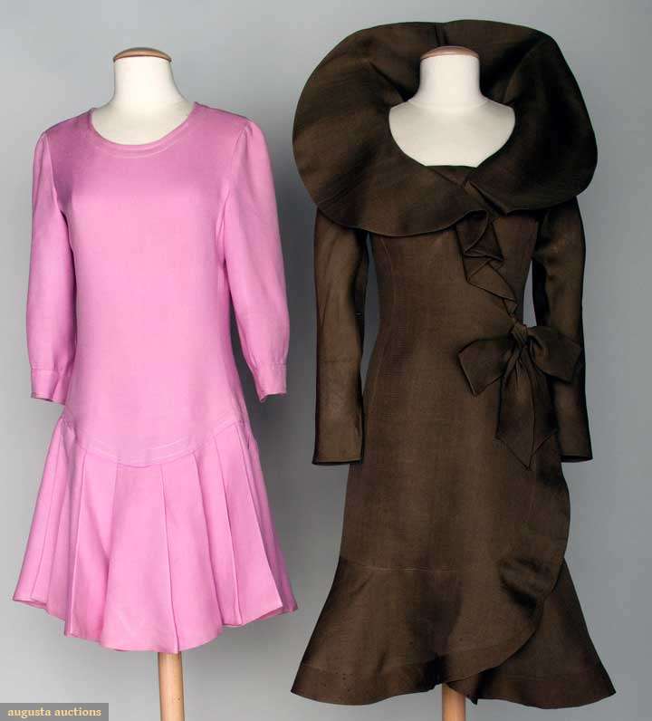 Both linen & unlabeled: 1 cocoa brown, stand up collar, side ruffle & bow, B 34", H 40", L 37", (alterations: all seams let out, large gore inserted in both sleeves, armscye not resewn evenly) fair; 1 pink, pleated skirt, B 34", W 30", L 36", excellent. Bought at Pierre Cardin in Paris.