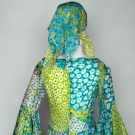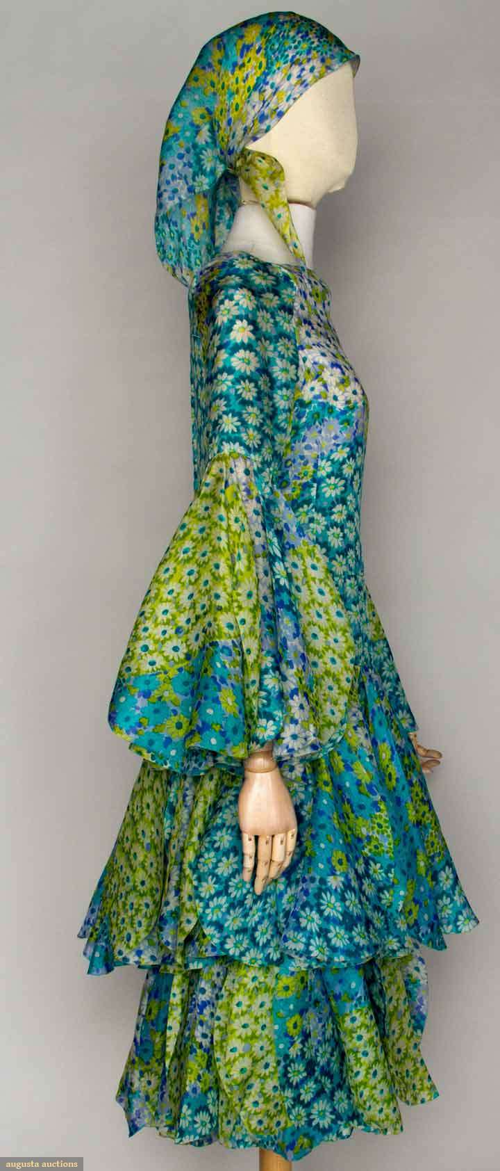 Silk organdy w/ small blossom print in turquoise, lime, white, & purple, square ballet neckline, long sleeves, 2 tiers of petal shaped panels below hips & on sleeves, matching neck scarf, bouquet of silk flowers at neckline, label "Pierre Cardin Paris", B 34", W 27", L 46", (small alteration by zipper) excellent. Provenance: Mme. Erna de Paz, Argentine & Parisienne socialite & friend of Msr. Cardin.