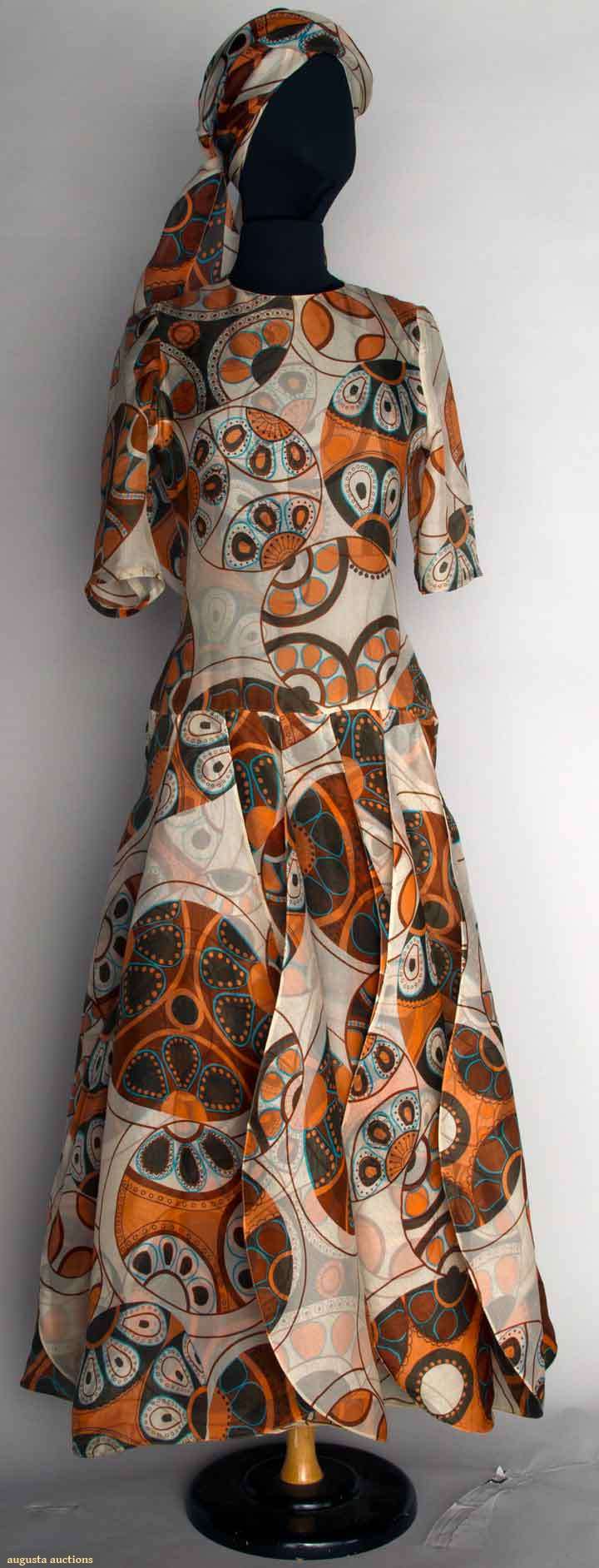 White silk organdy w/ printed circles in apricot, blue, & gray, short sleeved minidress w/ floor-length floating petal-shaped panels w/ wired edges, matching head scarf, B 34", W 28", L 30.5", L w/ petal panels 55.5", label "Pierre Cardin Paris", (side seams let out & pieced at underarm & zipper to enlarge, alterations by Cardin) excellent. Provenance: Mme. Erna de Paz, Argentine & Parisienne socialite & friend of Msr. Cardin.