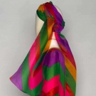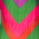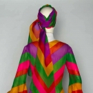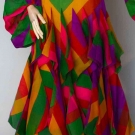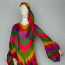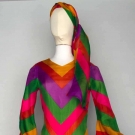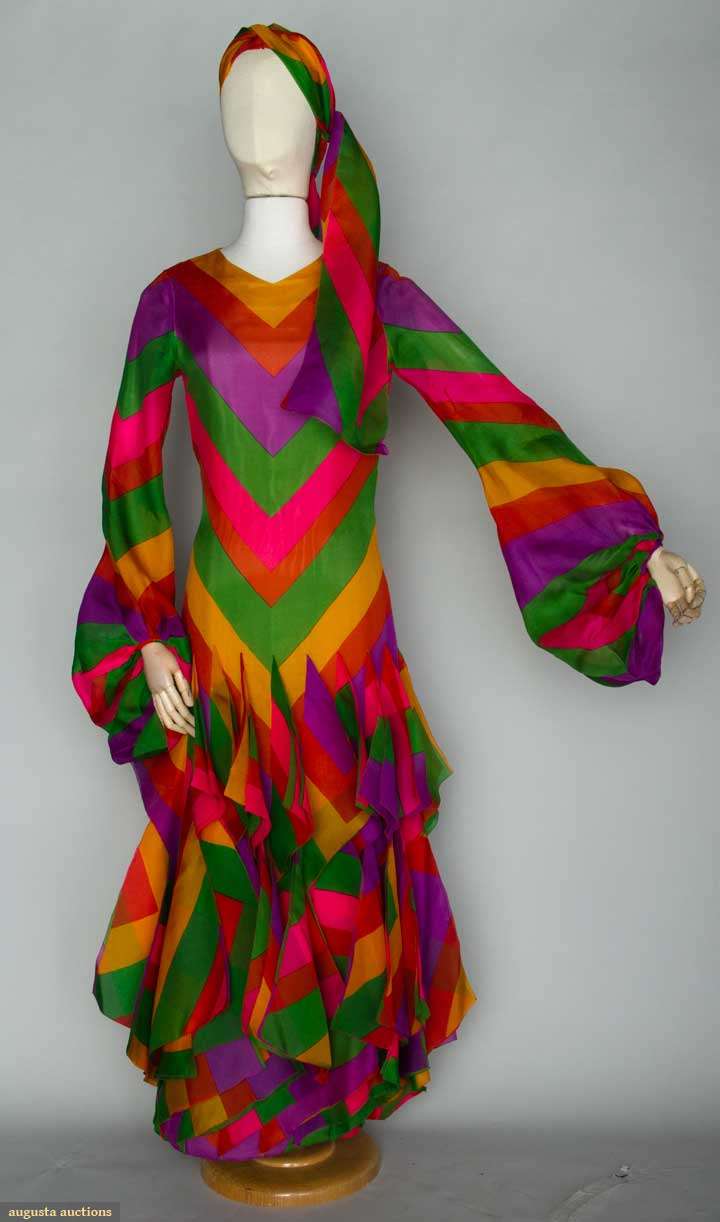Silk organdy w/ orange, red, purple, green, & pink chevron stripes, long balloon sleeves, floating triangular layers below hip, matching long scarf to wrap around head, label "Pierre Cardin Paris", B 34", H 36", L 56", (side seams let out & pieced at underarm seam to enlarge, alterations by Cardin, small fade mark under left arm) very good. Provenance: Mme. Erna de Paz, Argentine & Parisienne socialite & friend of Msr. Cardin.