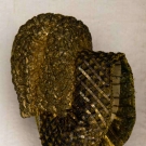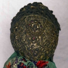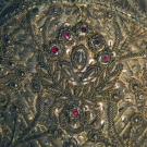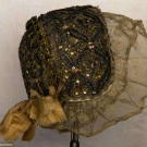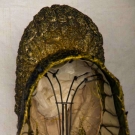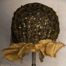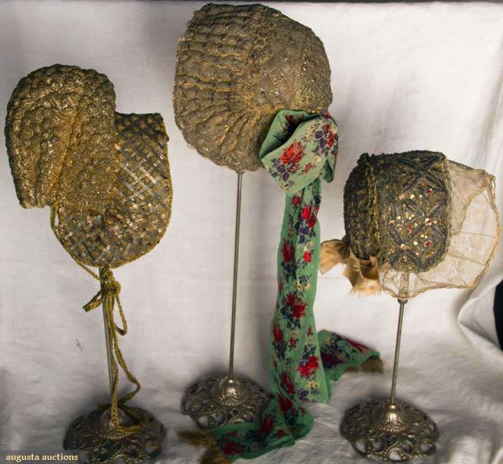 All metallic gold: 1 w/ lattice pattern brim; 1 w/ crimped brim & green & red brocade ribbon; 1 inset w/ small red jewels, lace trim, (some tarnishing) fair-very good.