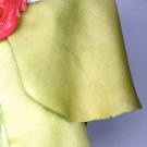 Chartreuse silk, 5 overlapping tiers on A-line dress, CF orange silk poppy, label "Pierre Cardin Paris", B 34", H 38", L 55", (yellow fading on all tiers) fair. Provenance: Mme. Erna de Paz, Argentine & Parisienne socialite & friend of Msr. Cardin.