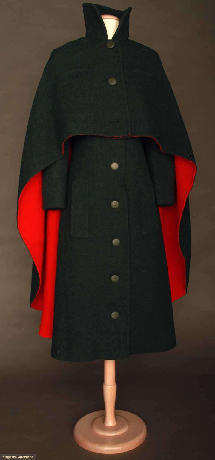 Loden green wool coat dress w/ round collar & side pockets, matching over-cape, asymmetrically cut from short front to full length in back, stand up collar, cape lined in red wool, unlabeled, Sh-Sh 14", B 34", Coat L 45", Cape L 14.5" - 44.5", excellent. Bought at Pierre Cardin Paris. Provenance: Mme. Erna de Paz, Argentine & Parisienne socialite & friend of Msr. Cardin.
