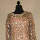 Nude net sheath, elbow length sleeves, embroidered all-over w/ gold or silver stylized branches & light & dark pink silk flowers, embroidery & net embellished w/ crystal & aurora borealis beads & jewel color beads in many shapes, 2nd layer of nude net beneath beaded net, attached nude silk faille full slip, back zipper, black on white silk "Mollie Parnis New York" label, B 36", W 33", H 37", L 53.5", excellent.
