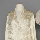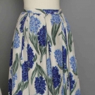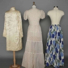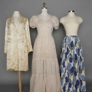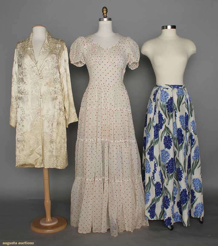 1 white organdy w/ red polkadot long gown; 1 blue hyacinth print evening skirt; 1 cream-on-cream embroidered evening coat.