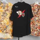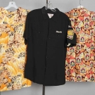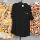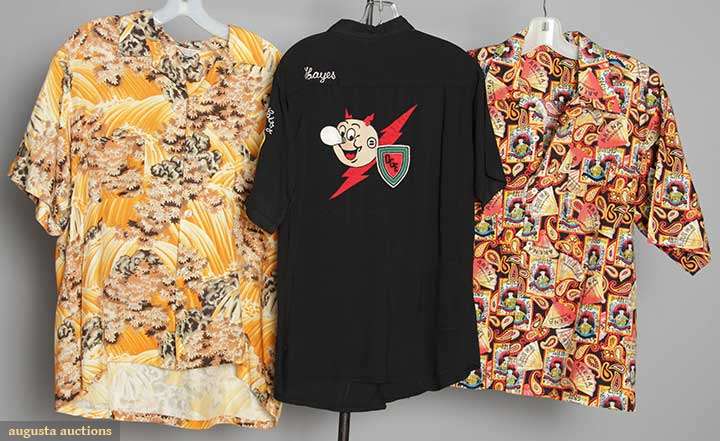 Embroidered, "Charlie Hayes Oklahoma City", back embroidered w/ smiling lightbulb & lightning, "1960-1961 League Champions" sleeve patch; t/w 2 1950-1960s short sleeve shirts: 1 w/ Spanish playing cards on cotton; 1 rayon w/ mountain scenes in yellow.