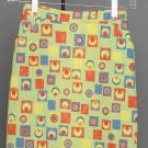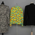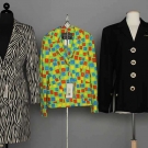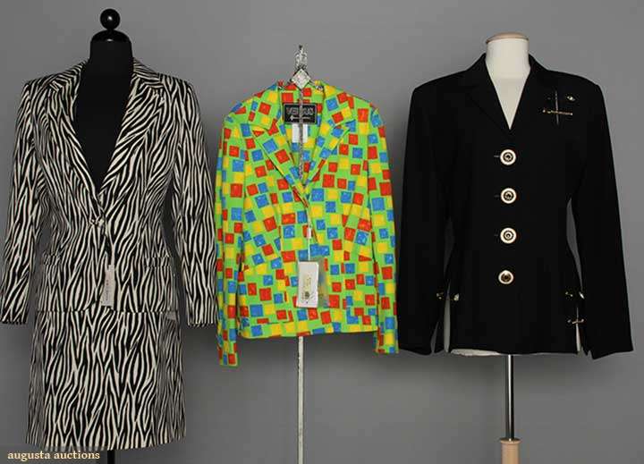 All deadstock: 1 black & white zebra print skirt suit; 1 green block & circle print short skirt; 1 green jacket w/ colorful block print; t/w 1 unlabeled black jacket w/ rhinestone buttons & safety pins.