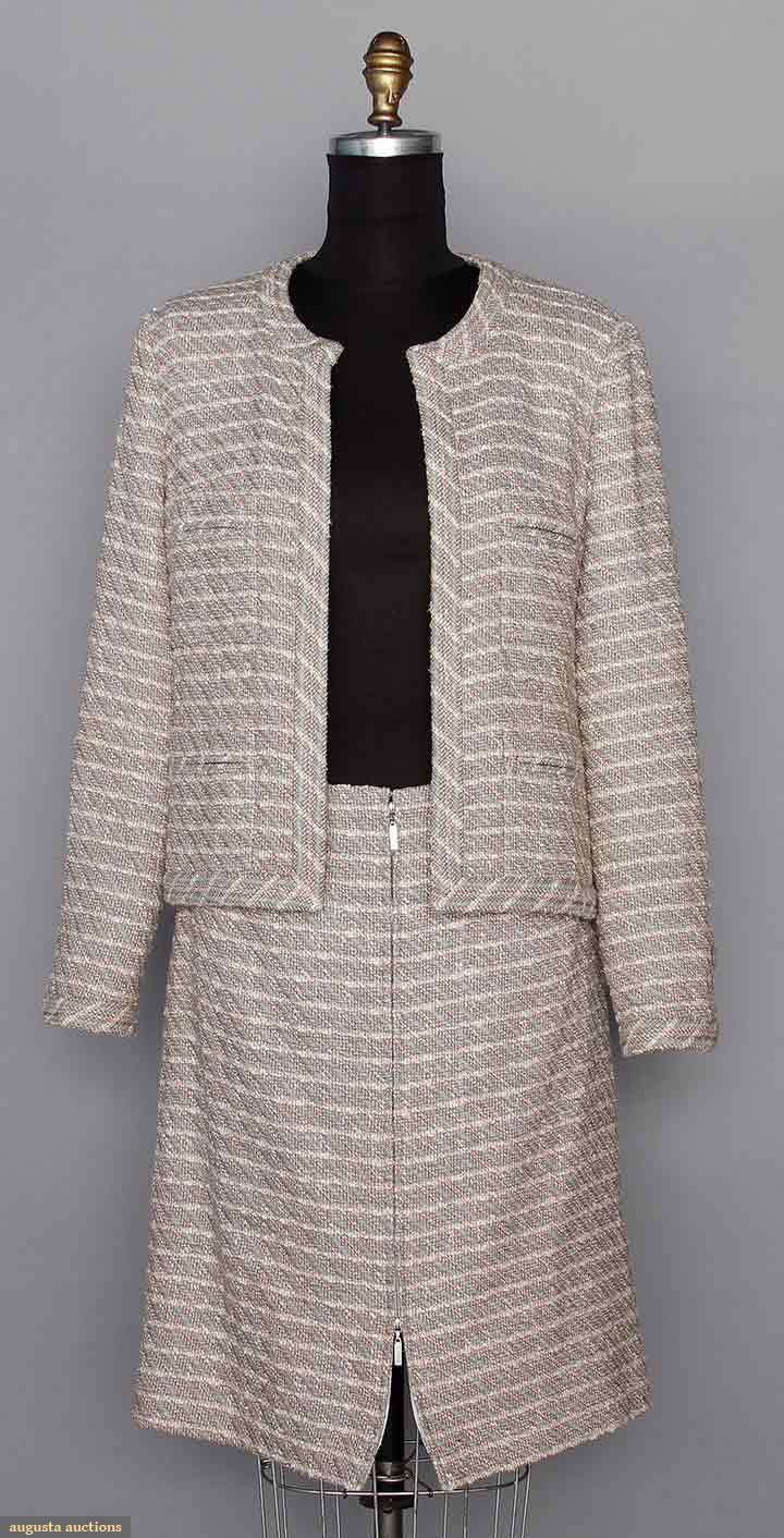 Wool, cotton & synthetic blend woven in light blue, rose & cream lattice pattern, open front jacket w/ 4 patch pockets, straight short skirt, 2 inset pockets at hip, CF silver metal zipper w/ logo zipper pulls, silk linings, marked Size 46, Jacket L 22", Skirt L 23.5", excellent. Estate of Karen Kendle Marshe, director of footwear for CHANEL USA.