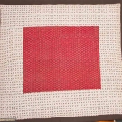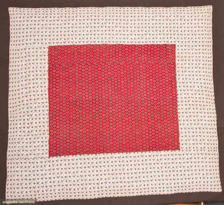 Red large square center w/ small yellow & green boteh print, deep border of printed roses & leaves on white, hand quilted in diamond pattern & 12 channel quilted row borders, backing of cinnamon & red printed calico, 64" x 70", (several light brown stains) very good.