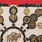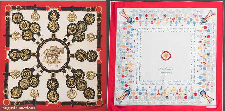 1 marked "Hermes Paris" & "Cuivreries" & signed "F. de Laperriere", center cartouche of work horse pair surrounded by equestrian tack, (light scattered stains & 1 very small hole) fair; t/w 1 white scarf marked "Celine Paris" & "Les Ecories Francaise", printed w/ deep border of mounted jockeys & in script the names of race horse owners, eg. "le baron de Lustrec", 35" x 35", excellent.