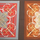 Both identical "Esperon D'Or" print in different colorways, print includes riding crop, stirrups, bridal bits, etc., 1 tomato red & grey & 1 in tan & brown, 35" x 35", excellent.