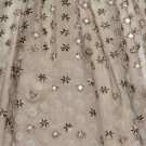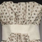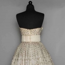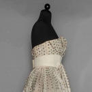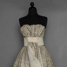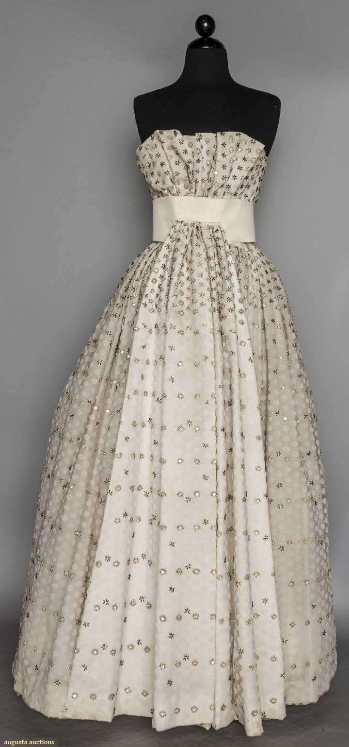 Unlabeled, dotted white lace embroidered w/ bead & rhinestone florets, strapless, large white silk midriff band w/ CF gathered panel, 2 numbered tapes on silk under dress, museum attribution, B 34", Hi W 30", CFL 56", (needs laundering, some lace tears, bead losses, long tan stain hidden beneath F floating panel) very good.