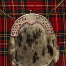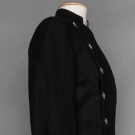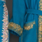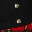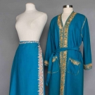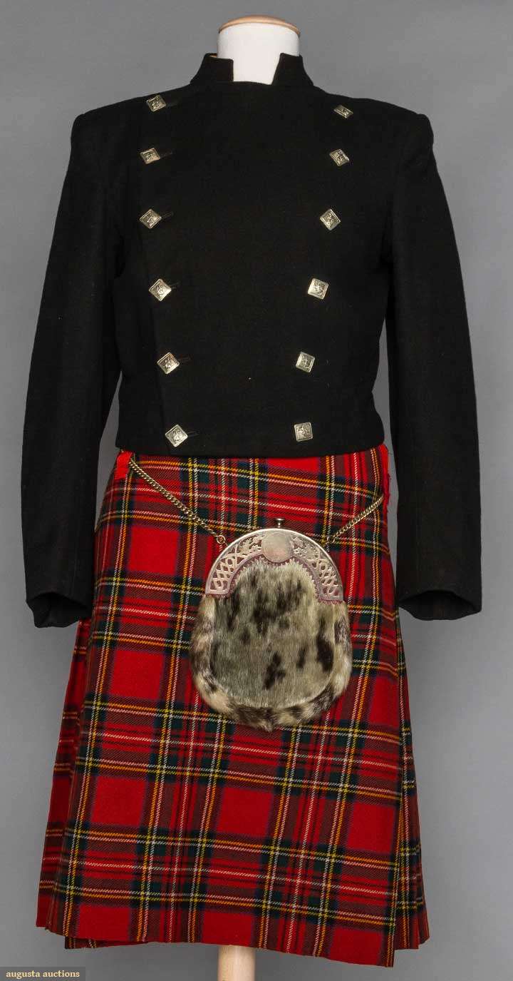 Black wool jacket w/ silver buttons, tartan plaid skirt, fur & silver sporran, CH 38", W 36", Skirt L 24", Jacket L 20", (damaged belt loop & messy repair on back near missing buckle) very good; t/w 2 turquoise wool garments: 1 lady's robe w/ metallic gold embroidery & 1 skirt w/ pastel silk embroidery, excellent.