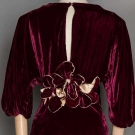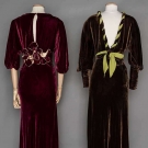 1 wine, balloon sleves, narrow V open back, H 37", L 57", (belt missing, small tear on 1 petal, small worn spot) very good; 1 brown, dolman sleeves, low V back trimmed w/ brown & green braid, W 28", L 61", excellent. Suddon-Cleaver Costume Collection