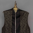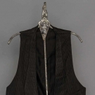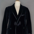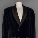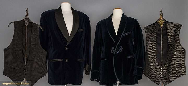 1 dark blue velvet dinner jacket, CH 42", L 32", 1 dark blue velvet smoking jacket, CH 40", L 29", 2 formal silk vests: 1 black & grey, CH 38", L 21", 1 black CH 38, L 21", all excellent. Suddon-Cleaver Costume Collection