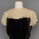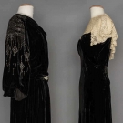 Both silk velvet, bias cut: 1 w/ lace collar, B 36", W 25", L 59", excellent; 1 w/ beaded bell sleeves, B 40", W 40", L 46", (bead loss, left cuff button damaged) very good. Suddon-Cleaver Costume Collection