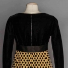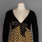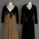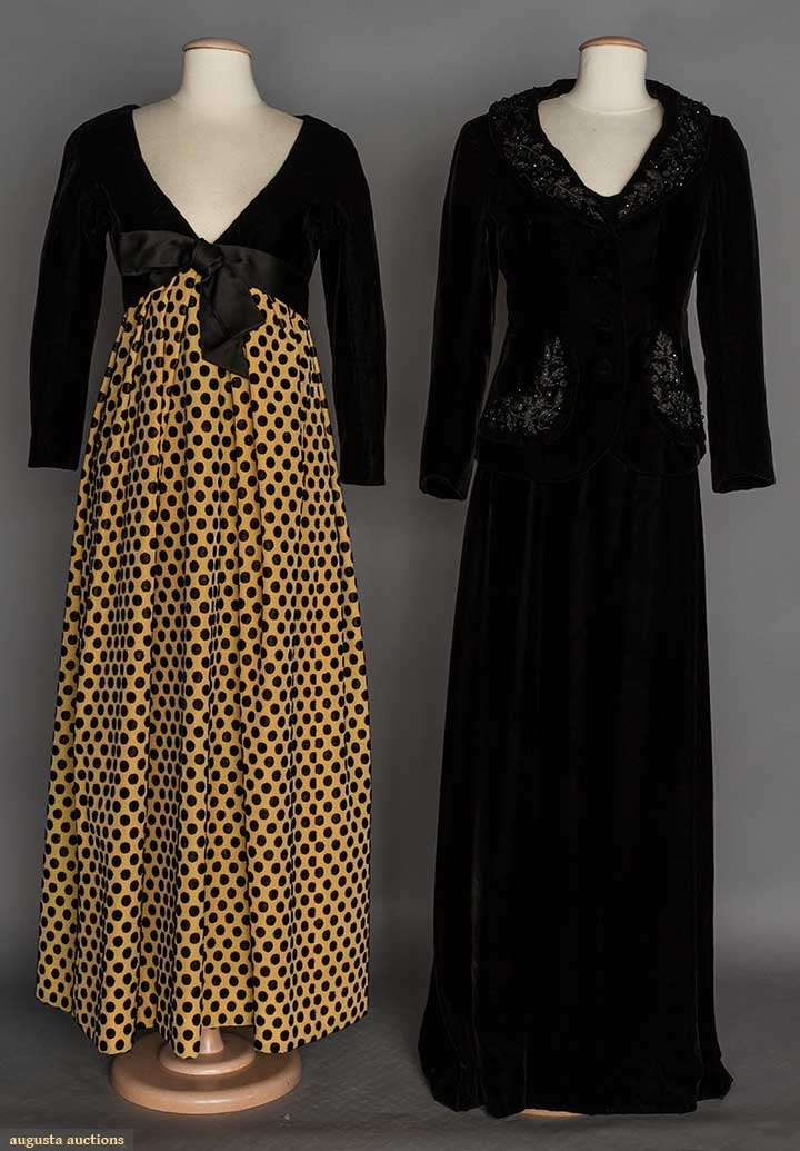 Scaasi black empire bodice, skirt w/ black velvet dots cut to yellow silk, B 36", Hi W 32", L 54", (tiny torn spot on bodice) very good; 1 Adolfo black velvet gown w/ jet beaded & embroidered jacket, B 32", W 30", L 59", excellent.