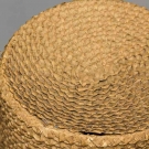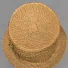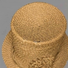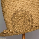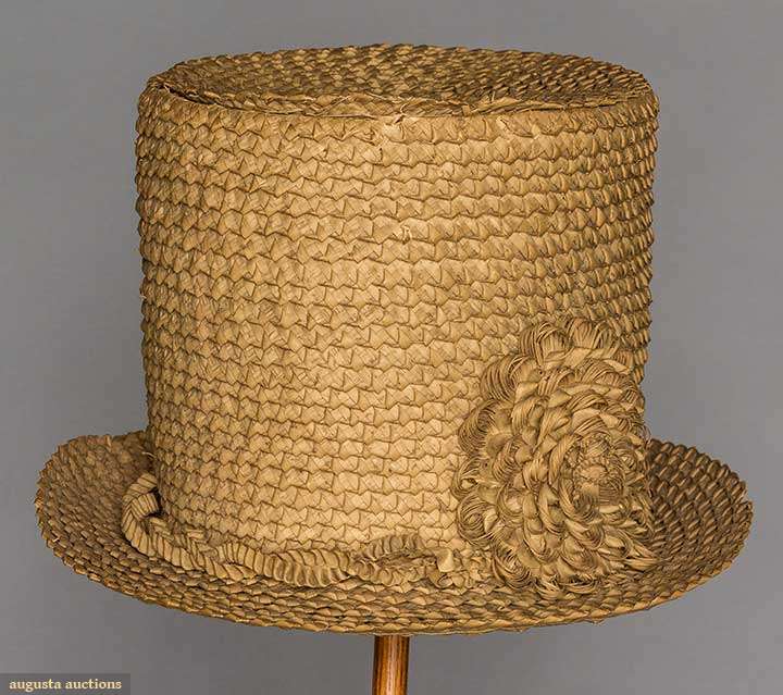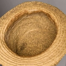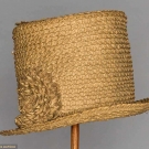 Braided chip straw (shaved wood) tall crown hat w/ narrow brim decorated w/ quilled chip blossom & entwined chip ribbon, linen interior sweat band, (4" unstitched area where top of hat joins sides) excellent. James Kochan - Don Troiani Collections