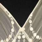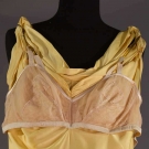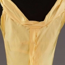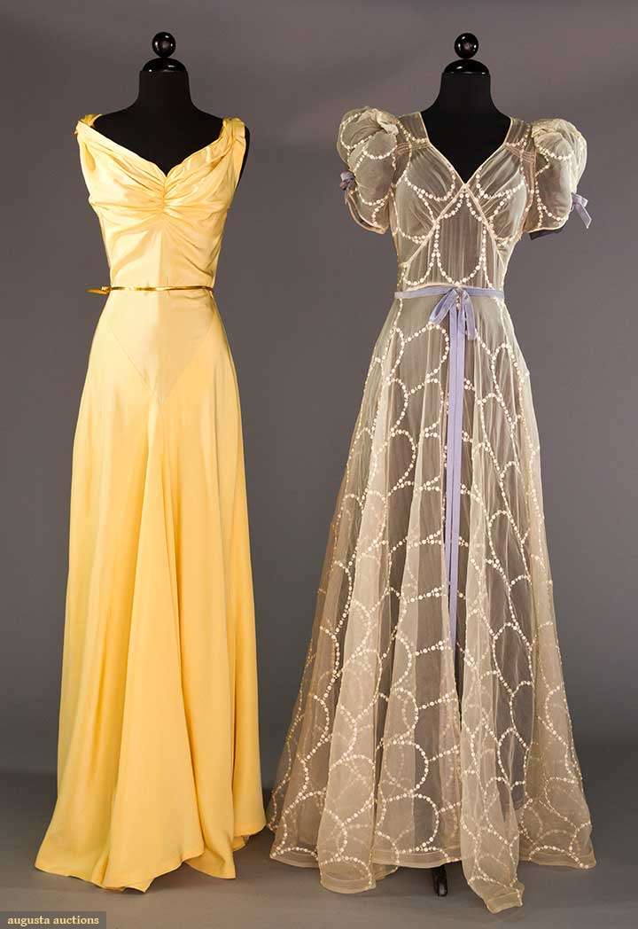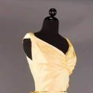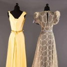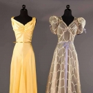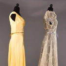 1 white leno weave brocaded in white garlands, blue ribbons, B 36", W 26", L 60", (few tiny stains & pin holes to bodice); 1 yellow silk faille, sleeveless, gold leather belt, B to 36", W 25", L 64", (neckline resewn, attached bra not original) very good.