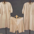 2 white w/ orange & black felt appliques: 1 w/ crossed oar appliques, "150" & "1940", (couple stains) very good & 1 w/ applique "150", excellent; 1 orange tee printed in black, "9 old men, 40, 1 oar crossed w/ 1 crutch", (stains) very good; t/w 2 light grey henley under-shirts & 1 pair button front briefs, excellent. Couple pieces w/ id tapes "George Harrison Hart".