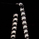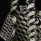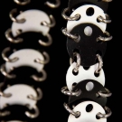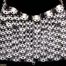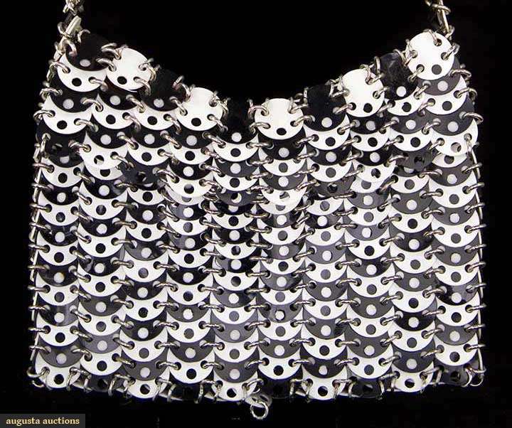 Unlabeled, black & white plastic discs joined w/ silver metal rings, 8.5"x6"x1", Strap Drop 9.5", (1 missing disc to strap & 1 to purse bottom) very good.